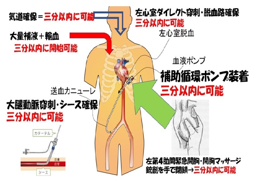 心臓が銃撃などで傷ついたときには止血と大量補液、特に循環再開が重要です。血液の循環停止から脳死に至るまでのタイムリミットは 3 分とされており、その前に循環を再開できる補助循環システムの実用化が望まれています。